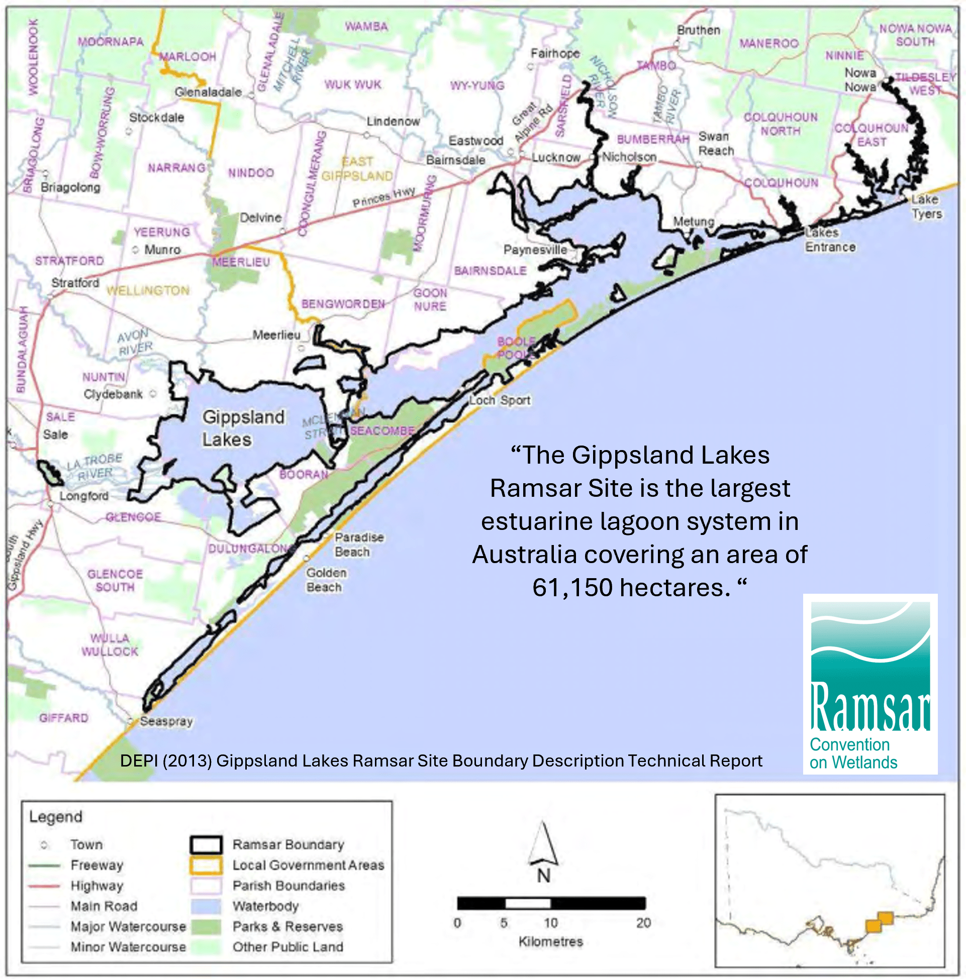The Gippsland Lakes, the largest estuarine lagoon system in Australia. Listed under the Ramsar convention as internationally important, and haven for many threatened and endangered species of birds and marine life. Home of First Nations people Gunaikurnai and the famous Burrunan Dolphins, and a boating and watersports mecca.